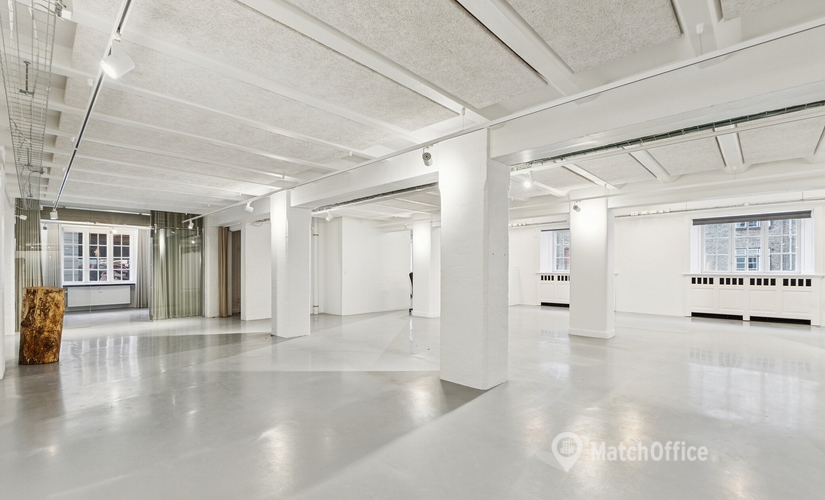 De store vinduespartier sikrer et flot dagslys i hele lejemålet, mens de eksisterende glasafskærmede rum giver mulighed for mødelokaler eller arbejdszoner uden at man bryder den åbne fornemmelse, mens de rå betongulve skaber en stilfuld og inspirerende ramme.
