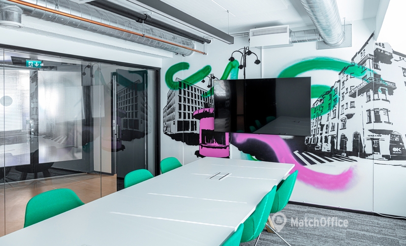 This 232 m² office is located on the 6th floor of the building. The space includes open office area, one meeting room, a private kitchen, toilets, and a shower. The space is in good condition and has plenty of windows that bring in natural light. The photos are general images of the property's spaces.